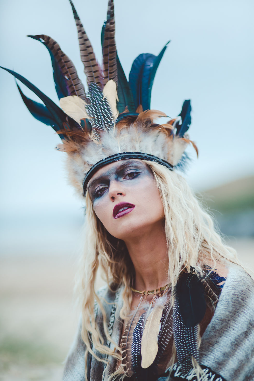 The final headpiece and to soften the look, we added a shawl for a more traditional tribal inspired look with a boho vibe. We headed back up to the sand dunes for softer colours and a more peaceful vibe whist refining the darker make up look.